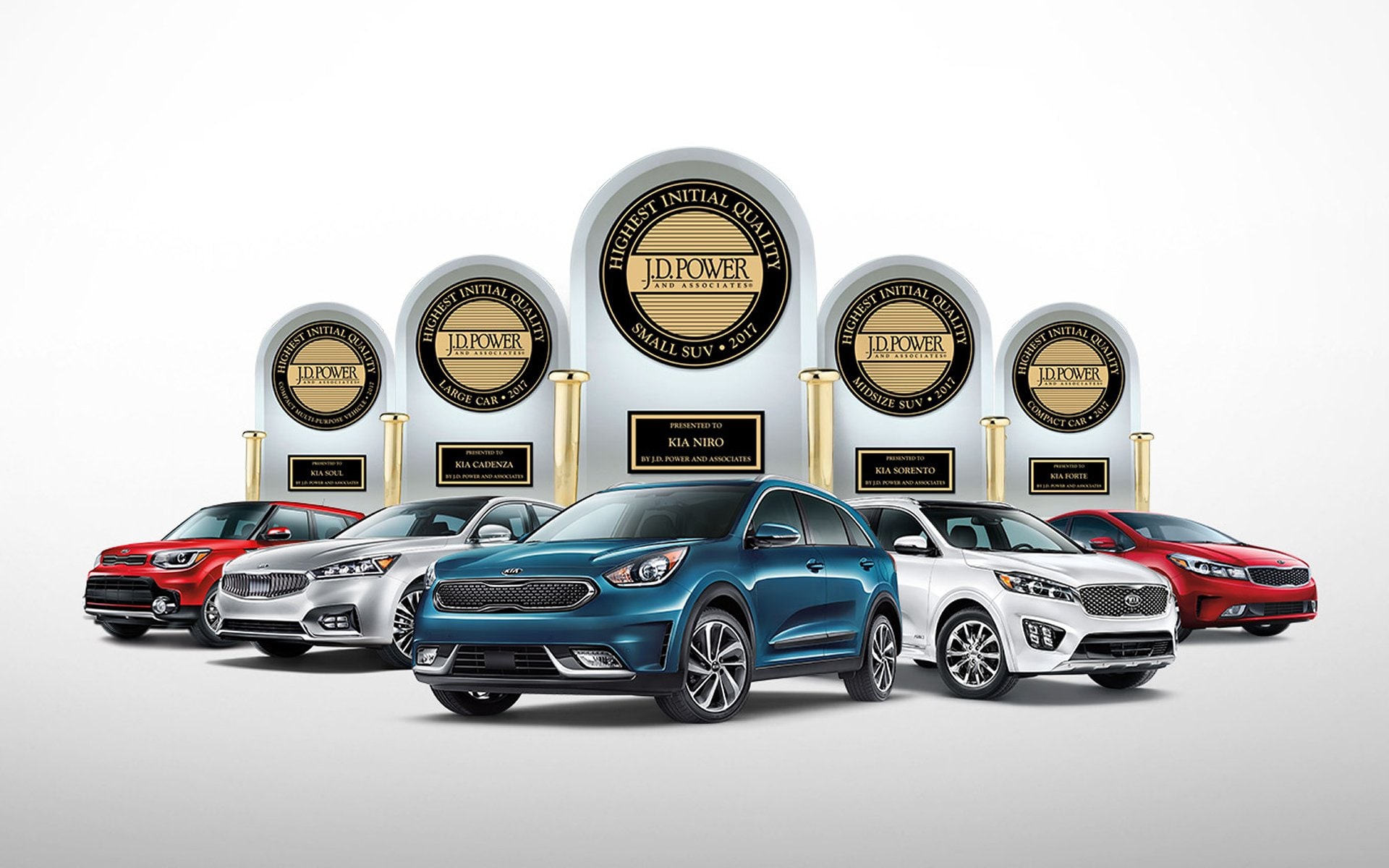 Highest ranking nameplate for the second straight year."HIGHEST RANKED LARGE CAR, COMPACT CAR, SMALL SUV, MIDSIZE SUV, AND COMPACT MULTI-PURPOSE VEHICLE IN INITIAL QUALITY"Kia proudly achieves the #1 spot in J.D. Power's 2017 Initial Quality Study, making it the second year in a row that the brand ranks highest in the entire industry. And given Kia's commitment to constant growth, its improved score reveals that Kia's new-vehicle quality is at its best yet.