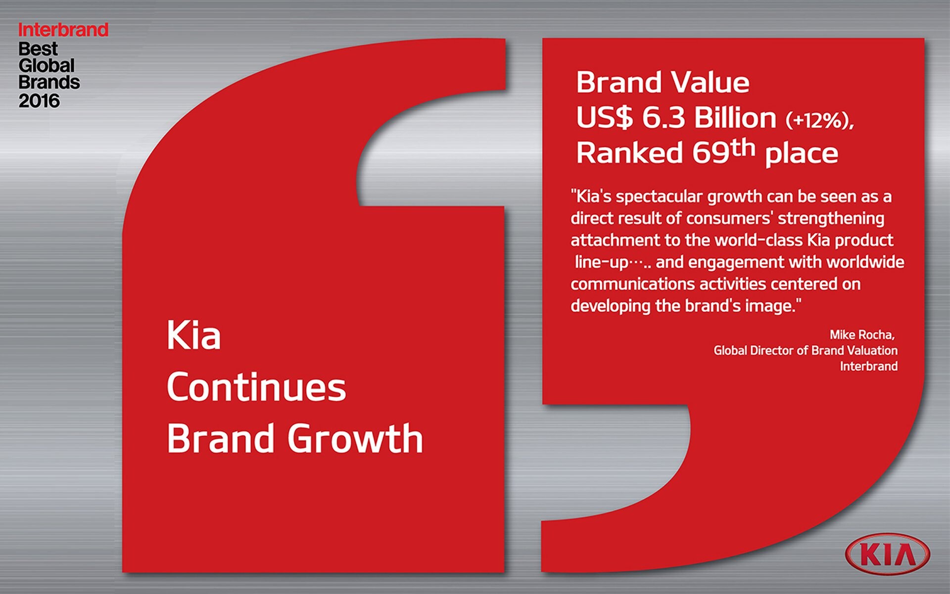 A 'Best Global Brand.' Five years in a row.We are proud to announce that for 2016, Kia has moved up to number 69 on Interbrand's list of 100 Best Global Brands, having made the cut for the fifth consecutive year. In just the past year, our strong performance as a global brand has increased our brand value more than 11%, growing to an estimated $6.3 billion USD. In fact, in the four years since just 2012, our brand value is up over 50%, and an astounding 6.5x since 2007.